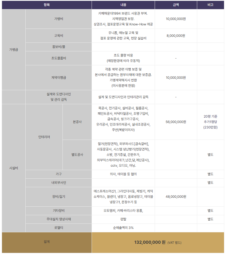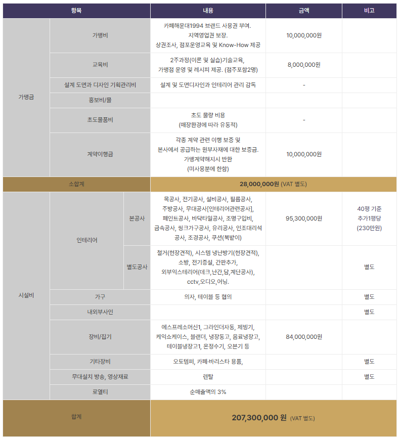 | 가맹금 | 가맹비 | 카페해운대1994 브랜드 사용권 부여. 지역영업권 보장. 상권조사, 점포운영교육 및 Know-How 제공 | 10,000,000원 | ||